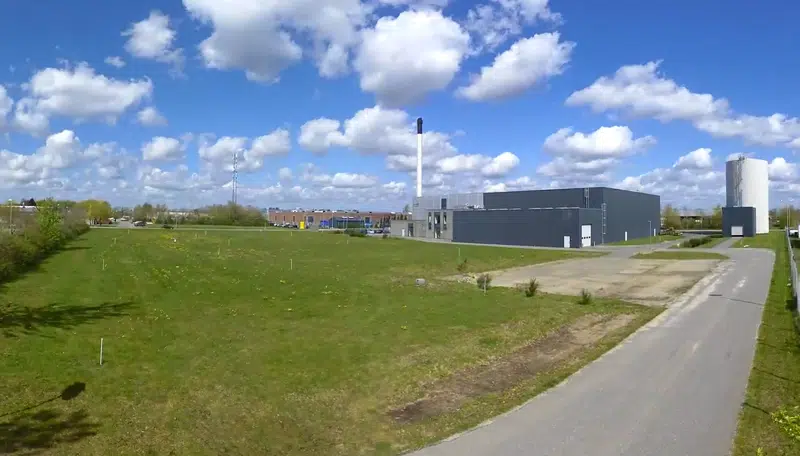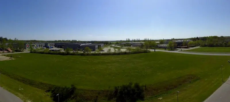 Klik på billedet til højre og følg med i byggeriet på Rugmarken - set fra taget af halmkedelbygningen.