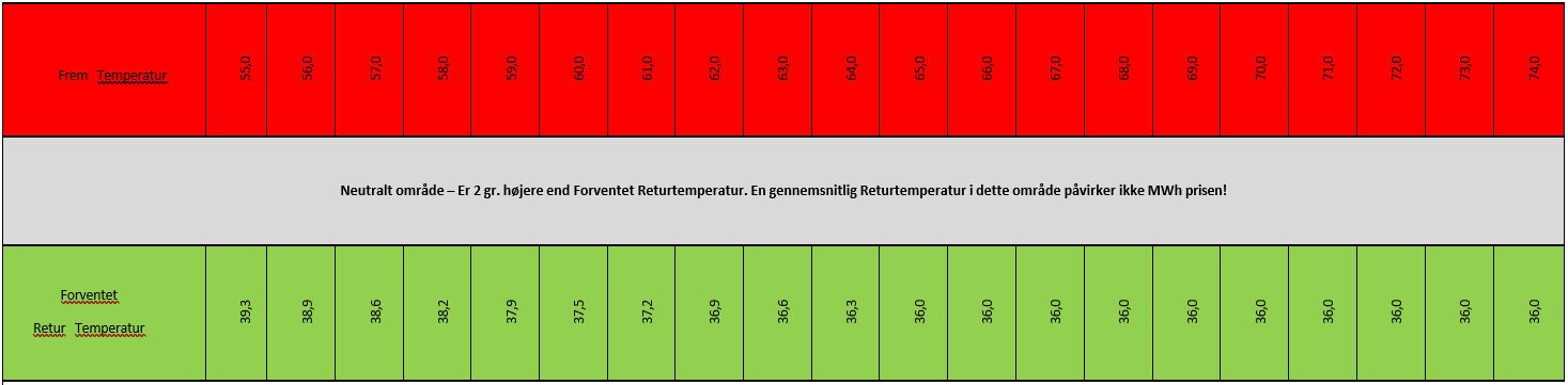 Hvis den gennemsnitlige returtemperatur ligger under den forventede returtemperatur reduceres MWh prisen med 2% pr. grad den er under. Er returtemperaturen derimod over det forventede stiger MWh prisen 2% pr. grad den ligger over, med undtagelse af de første to grader – som er defineret Neutral området.